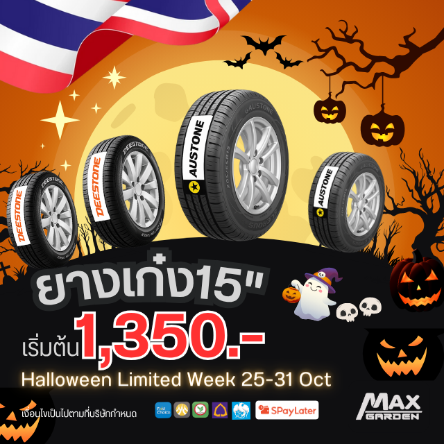 HALLOWEEN TIRE DEAL 2025 ยางเก๋ง 15” เริ่มต้นเพียง 1,350.- โปรแรงแห่งปี เฉพาะ 25 – 31 ตุลาคม นี้เท่านั้น!